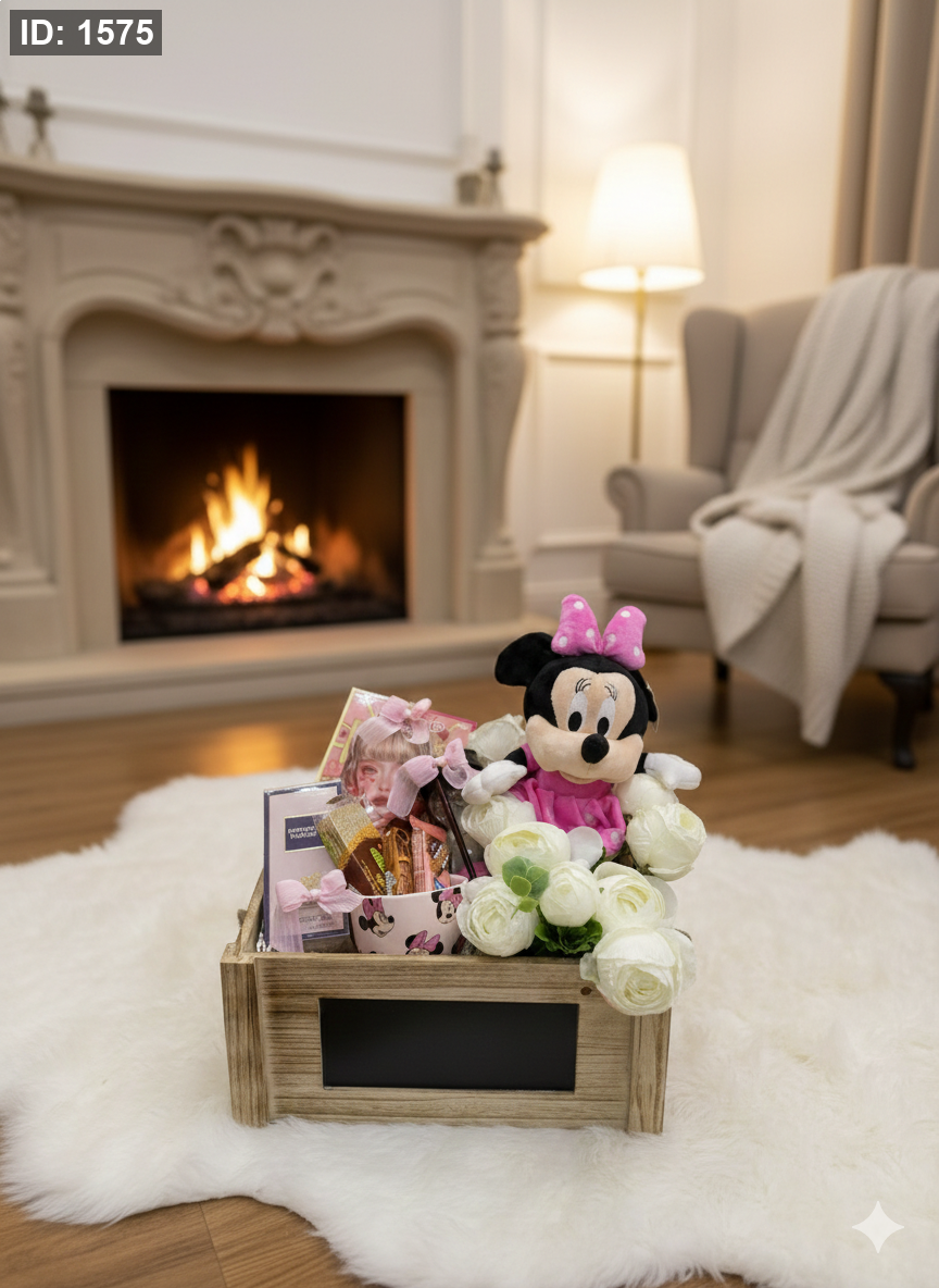 تتكون هذه الهديه من دب ميكي ماوس وعطر goodnight و كوب ميكي ماوس و شوكولاته و دفتر مكياج و ساعة رمليه وورد وصندوق خشب