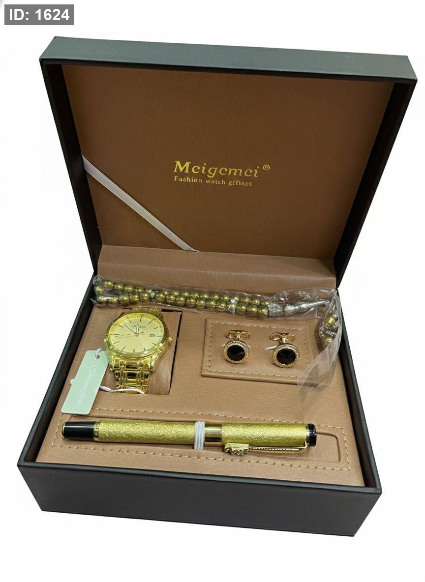 طقم ساعة رجالي مكفول اللون مع مسبحة و قلم و أزرار جاكيت