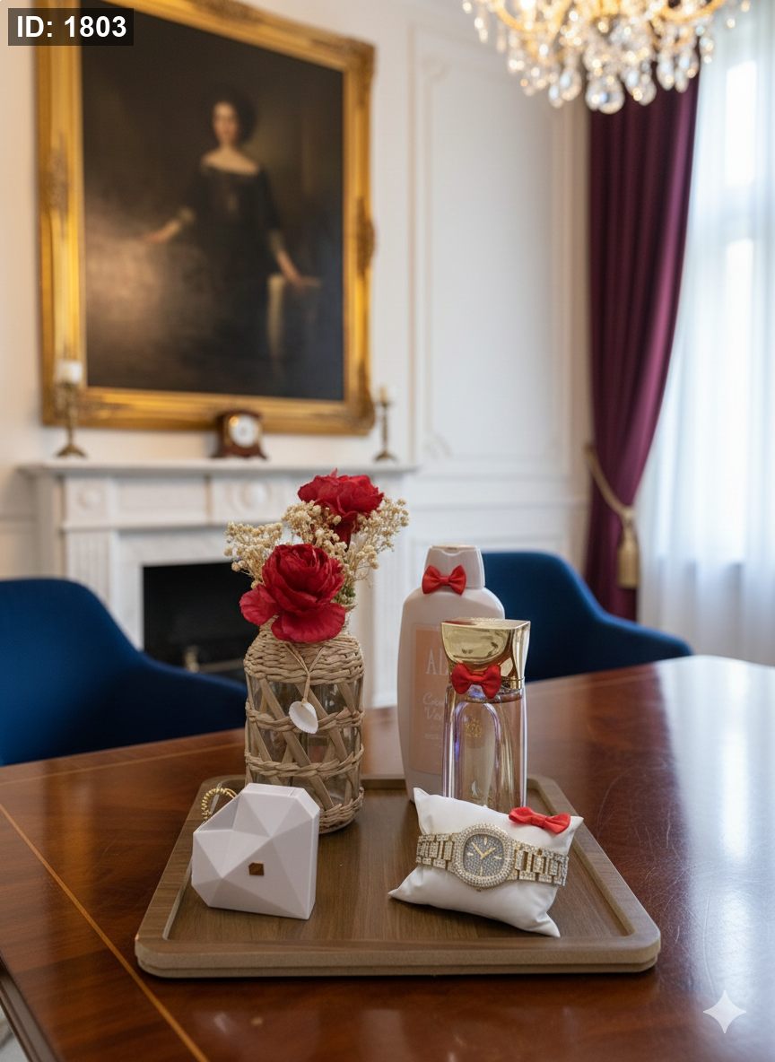 تتكون هذه الهديه من تحفة مرطبان مع ورد ومرطب ALN و خاتم بعلبة مع كبسة وعطر nexa وساعة مكفولة اللون