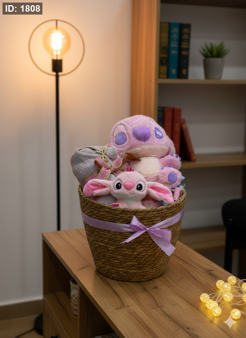 تتكون هذه الهديه من ستيتش زهري وبلوزة صوف قصيره ومدالية ستيتش وكوب ستيتش وملمع شفاه ستيتش و سلة قش