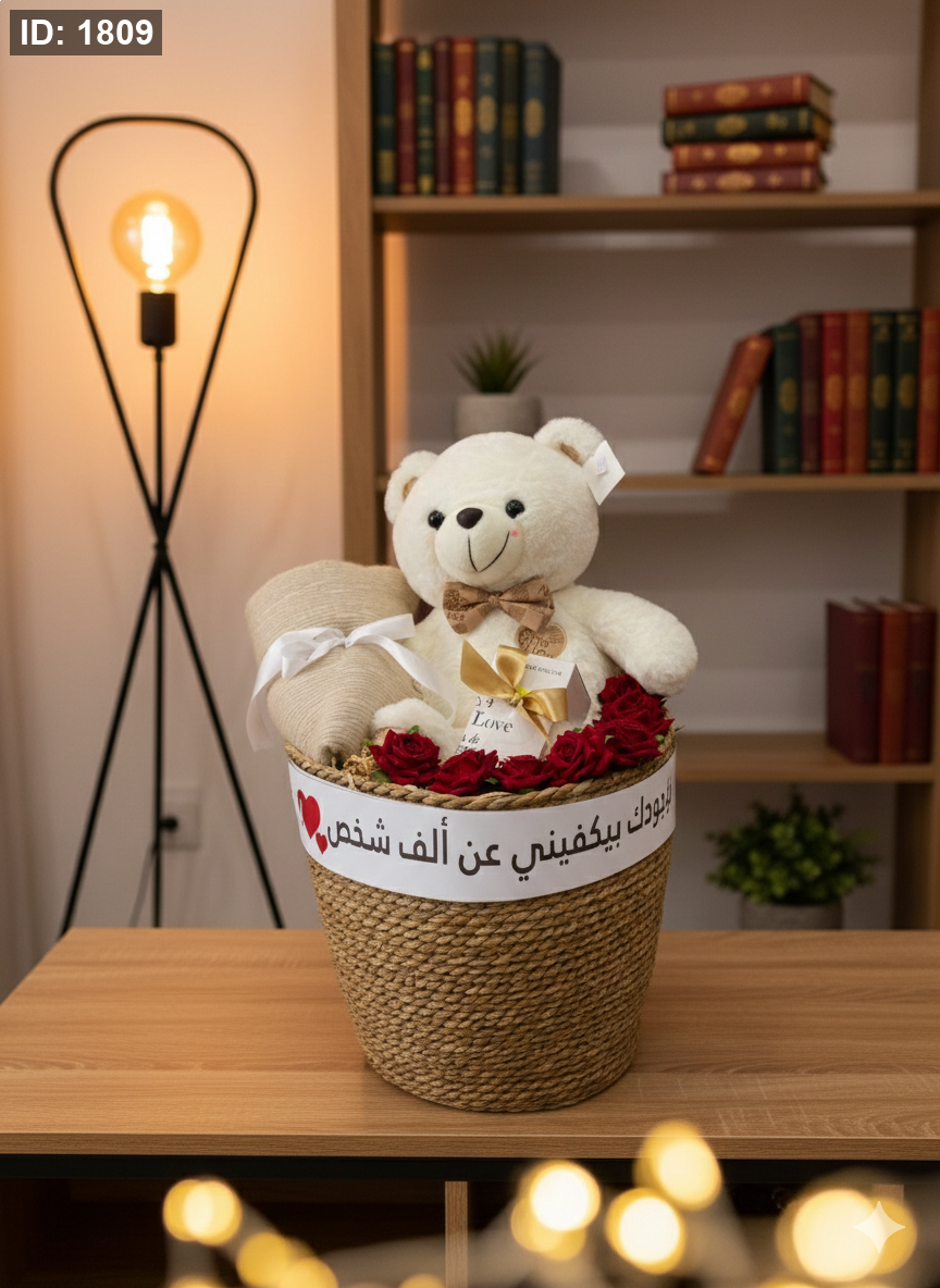تتكون هذه الهديه من دبدوب وسط و بلوزة dmc مبطنه و عطر after love و ورد و سلة قش
