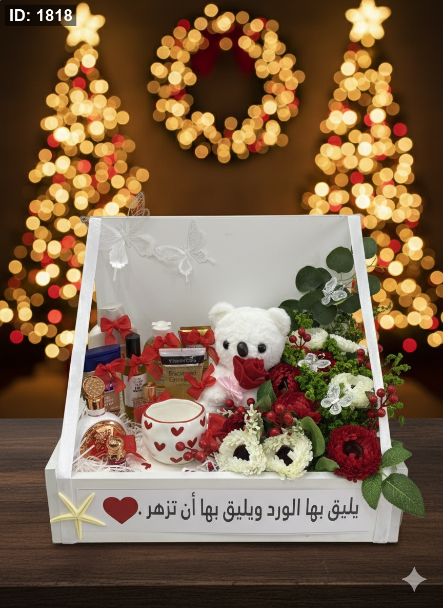 تتكون هذه الهديه من صندوق خشب ثقيل وورد ودبدوب و كوب مع صحن و تنت و عطر فخر لطافة وسبلاش جسم ومسك القرشي وغسول للوجه ومزيل مكياج وماسك للوجه و مرطب ألن