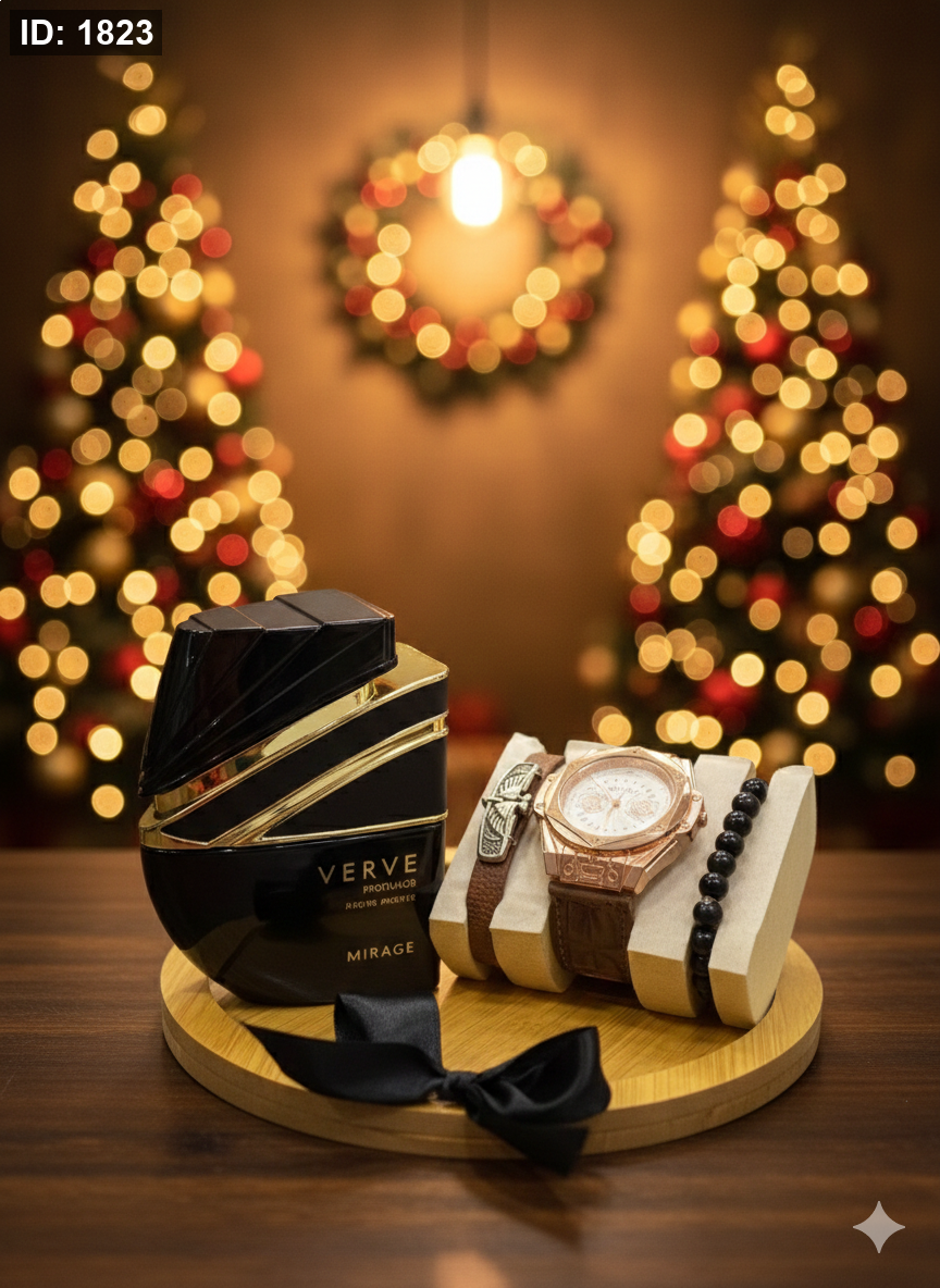 تتكون هذه الهديه من طقم ساعه مع اساور و عطر verve مع قاعده خشبيه