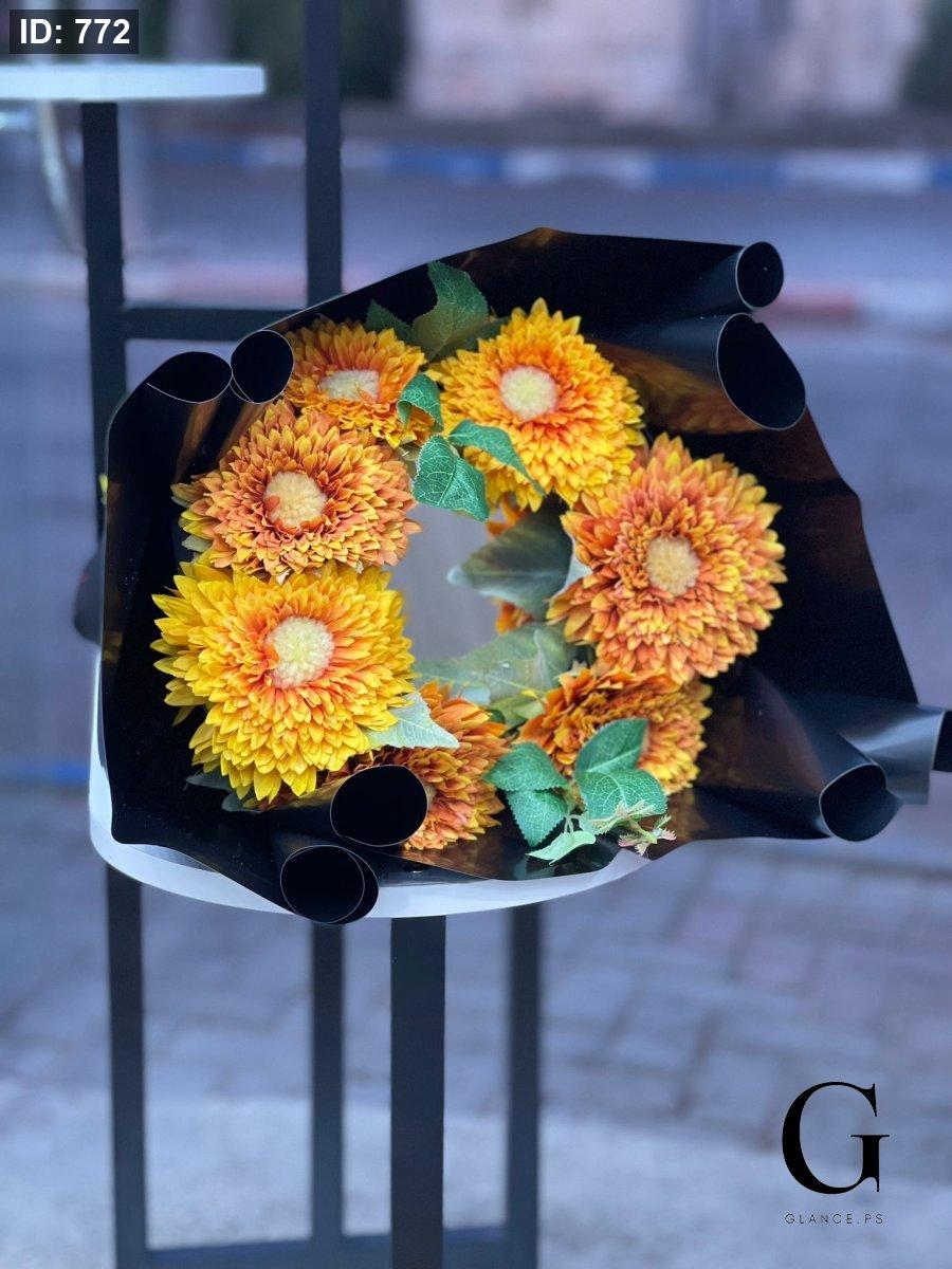 باقة ورد دوار الشمس مع مرآة دائريه مغلف ب ورق أسود