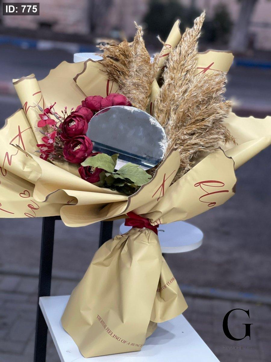 باقة ورد خمري مع مرآة دائرية و ورق بيج بأطراف رماديه